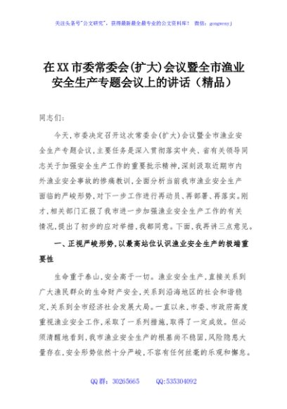 / 在XX市委常委会(扩大)会议暨全市渔业安全生产专题会议上的讲话(精品)