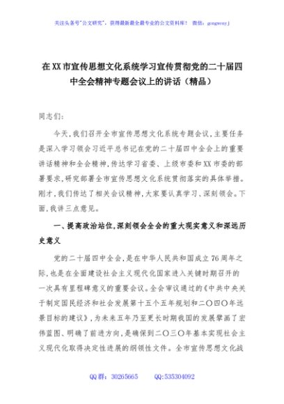 / 在XX市宣传思想文化系统学习宣传贯彻党的二十届四中全会精神专题会议上的讲话(精品)