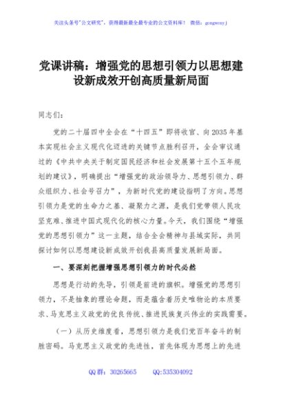 / 党课讲稿:增强党的思想引领力以思想建设新成效开创高质量新局面