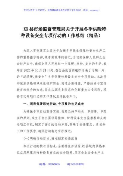 / XX县市场监督管理局关于开展冬季供暖特种设备安全专项行动的工作总结(精品)
