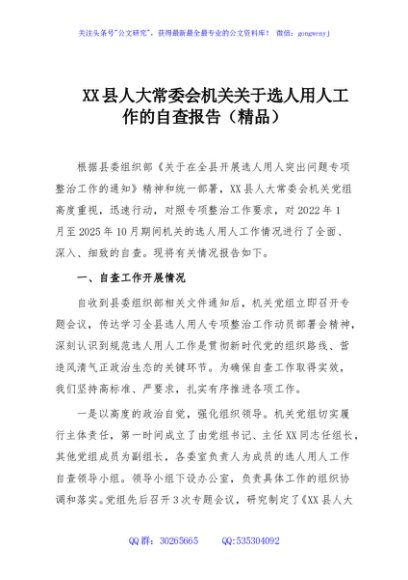 / XX县人大常委会机关关于选人用人工作的自查报告(精品)