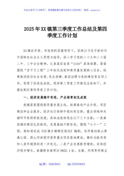 / 2025年XX镇第三季度工作总结及第四季度工作计划