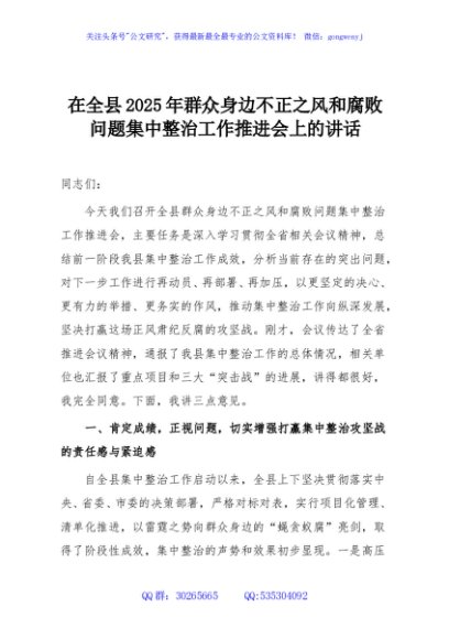 / 在全县2025年群众身边不正之风和腐败问题集中整治工作推进会上的讲话
