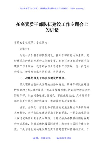 / 在高素质干部队伍建设工作专题会上的讲话