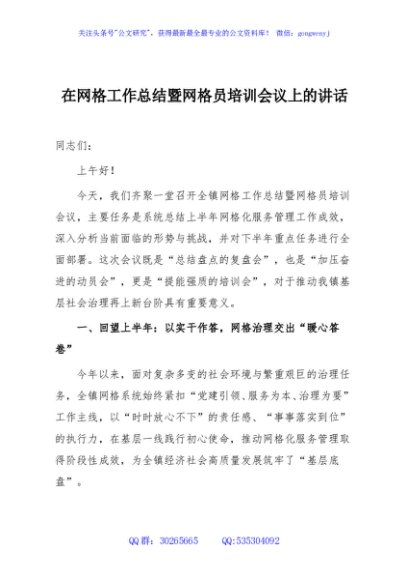 / 在网格工作总结暨网格员培训会议上的讲话