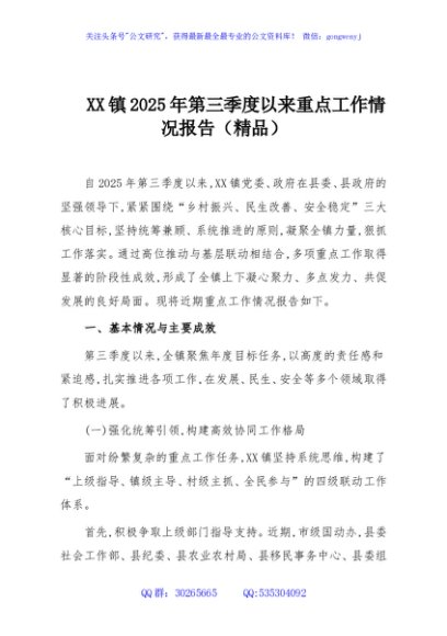 / XX镇2025年第三季度以来重点工作情况报告(精品)