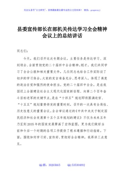 / 县委宣传部长在部机关传达学习全会精神会议上的总结讲话
