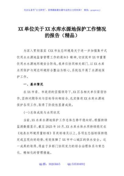 / XX单位关于XX水库水源地保护工作情况的报告(精品)