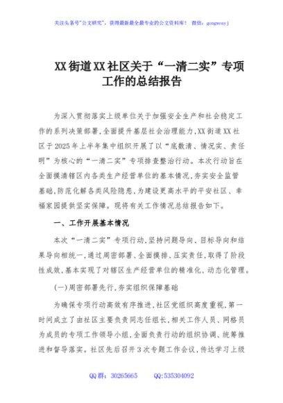/ XX街道XX社区关于“一清二实”专项工作的总结报告