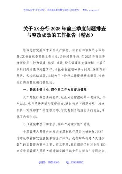 / 关于XX分行2025年前三季度问题排查与整改成效的工作报告(精品)