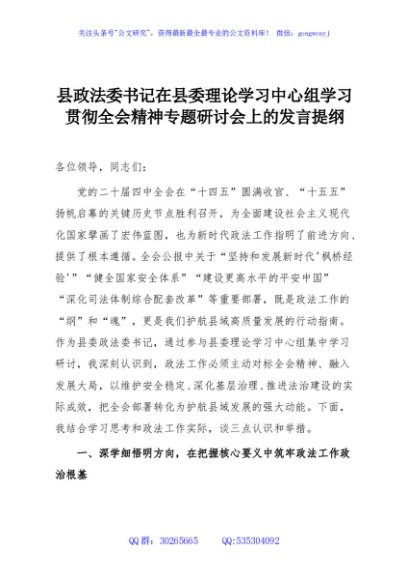 / 县政法委书记在县委理论学习中心组学习贯彻全会精神专题研讨会上的发言提纲