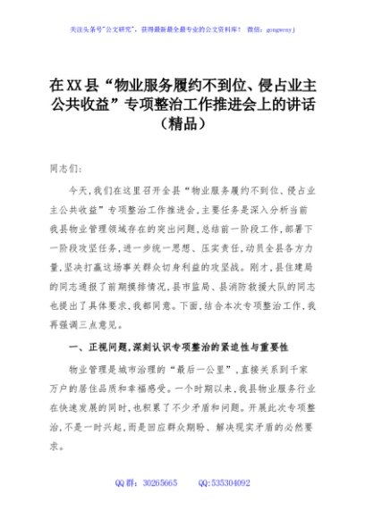/ 在XX县“物业服务履约不到位、侵占业主公共收益”专项整治工作推进会上的讲话(精品)