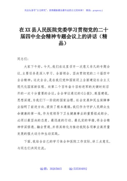 / 在XX县人民医院党委学习贯彻党的二十届四中全会精神专题会议上的讲话(精品)