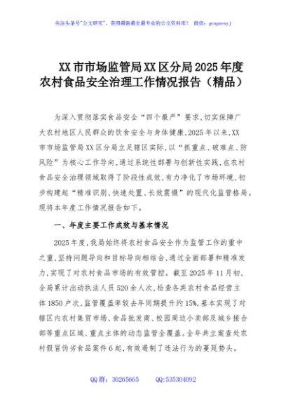 / XX市市场监管局XX区分局2025年度农村食品安全治理工作情况报告(精品)