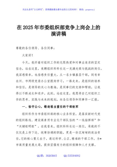 / 在2025年市委组织部竞争上岗会上的演讲稿