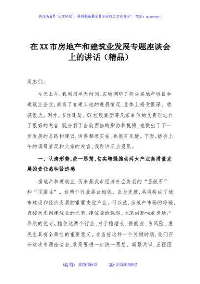 / 在XX市房地产和建筑业发展专题座谈会上的讲话(精品)