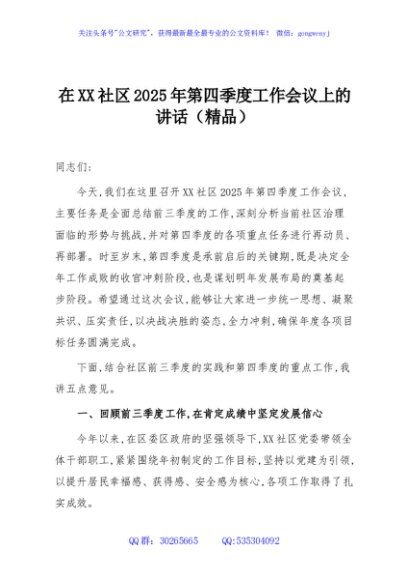 / 在XX社区2025年第四季度工作会议上的讲话(精品)