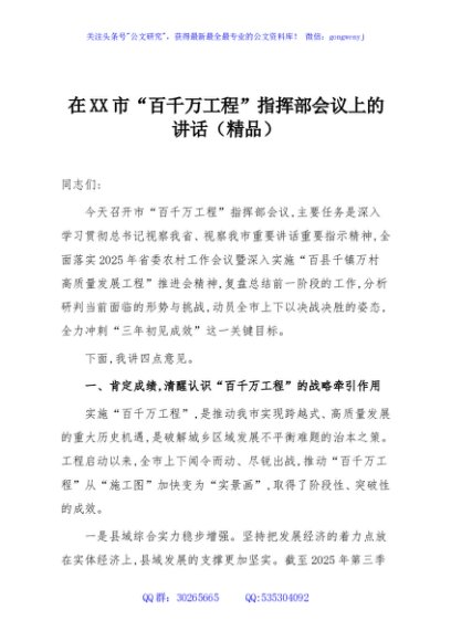 / 在XX市“百千万工程”指挥部会议上的讲话(精品)