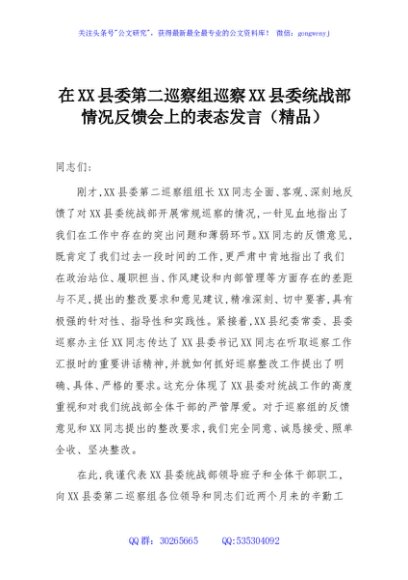 / 在XX县委第二巡察组巡察XX县委统战部情况反馈会上的表态发言(精品)