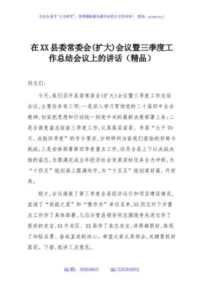 / 在XX县委常委会(扩大)会议暨三季度工作总结会议上的讲话(精品)