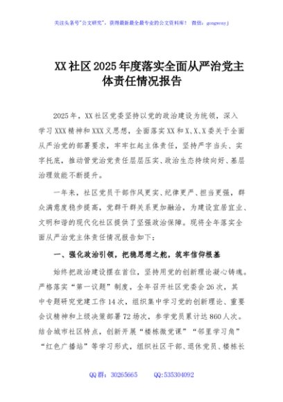 / XX社区2025年度落实全面从严治党主体责任情况报告