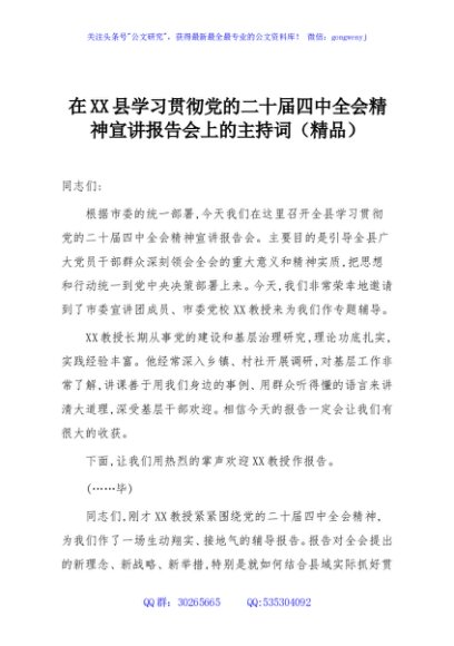 / 在XX县学习贯彻党的二十届四中全会精神宣讲报告会上的主持词(精品)
