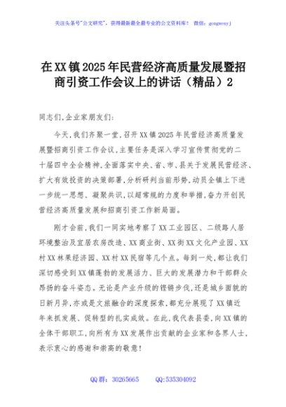 / 在XX镇2025年民营经济高质量发展暨招商引资工作会议上的讲话(精品)2