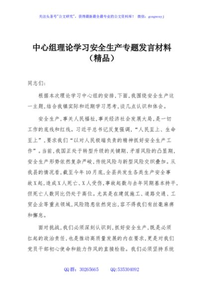 / 中心组理论学习安全生产专题发言材料(精品)