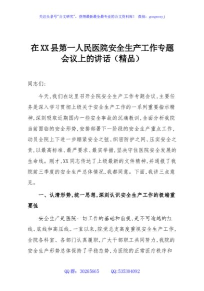 / 在XX县第一人民医院安全生产工作专题会议上的讲话(精品)