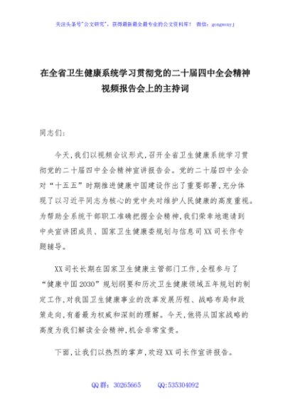 / 在全省卫生健康系统学习贯彻党的二十届四中全会精神视频报告会上的主持词