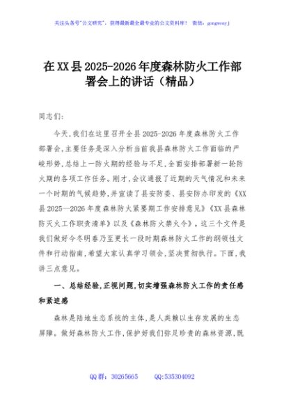 / 在XX县2025-2026年度森林防火工作部署会上的讲话(精品)