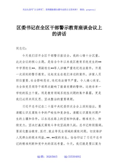 / 区委书记在全区干部警示教育座谈会议上的讲话