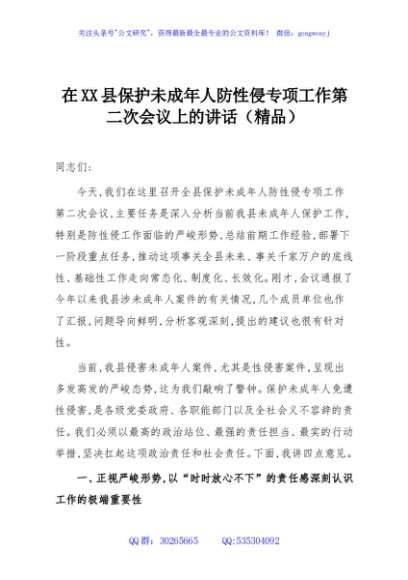/ 在XX县保护未成年人防性侵专项工作第二次会议上的讲话(精品)