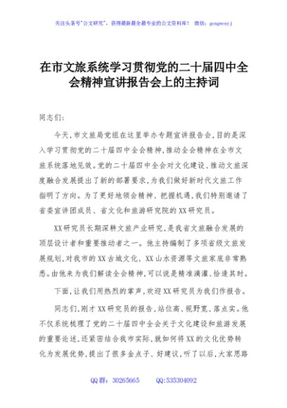 / 在市文旅系统学习贯彻党的二十届四中全会精神宣讲报告会上的主持词