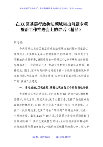 / 在XX区基层行政执法领域突出问题专项整治工作推进会上的讲话(精品)