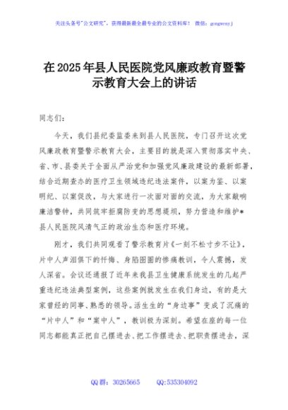 / 在2025年县人民医院党风廉政教育暨警示教育大会上的讲话