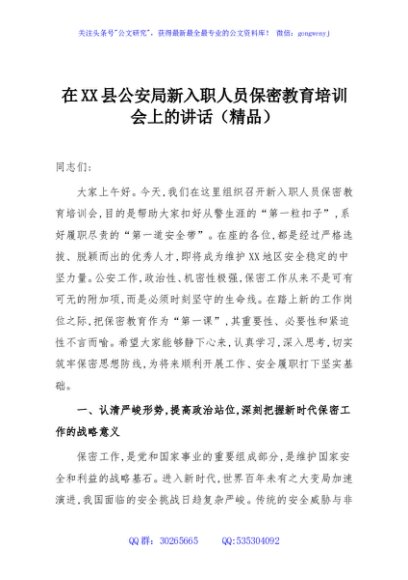 / 在XX县公安局新入职人员保密教育培训会上的讲话(精品)