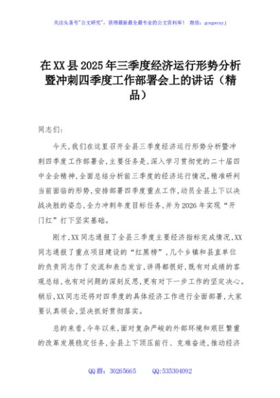 / 在XX县2025年三季度经济运行形势分析暨冲刺四季度工作部署会上的讲话(精品)