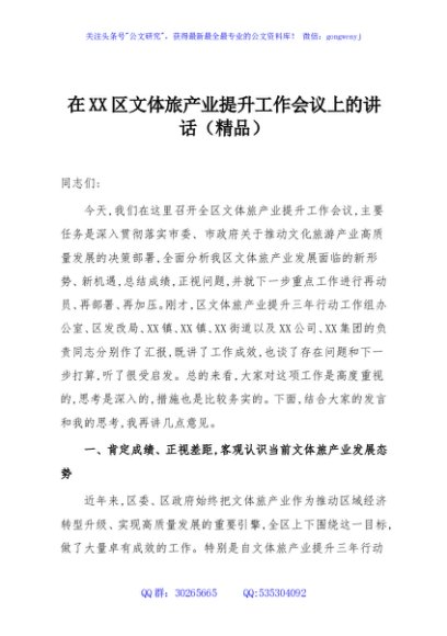 / 在XX区文体旅产业提升工作会议上的讲话(精品)