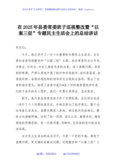 / 在2025年县委常委班子巡视整改暨“以案三促”专题民主生活会上的总结讲话