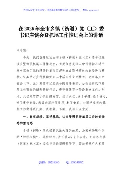 / 在2025年全市乡镇(街道)党(工)委书记座谈会暨抓尾工作推进会上的讲话