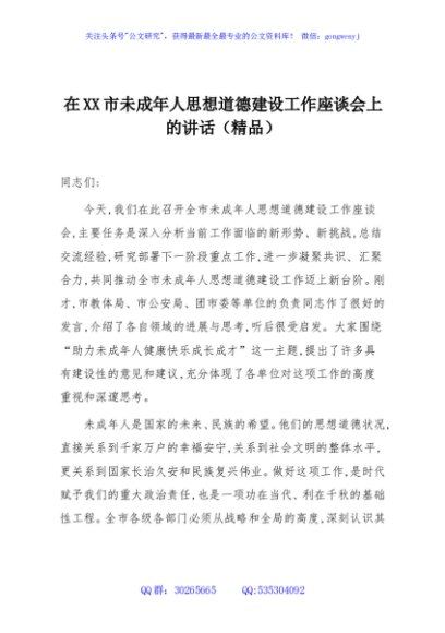 / 在XX市未成年人思想道德建设工作座谈会上的讲话(精品)