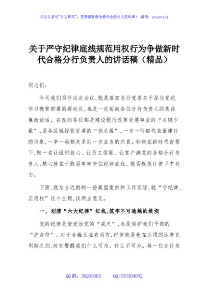 / 关于严守纪律底线规范用权行为争做新时代合格分行负责人的讲话稿(精品)