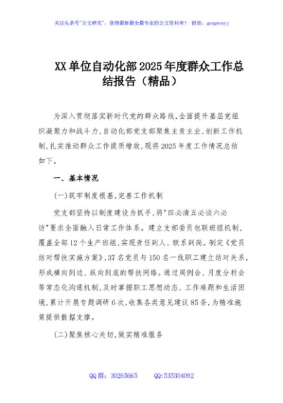 / XX单位自动化部2025年度群众工作总结报告(精品)