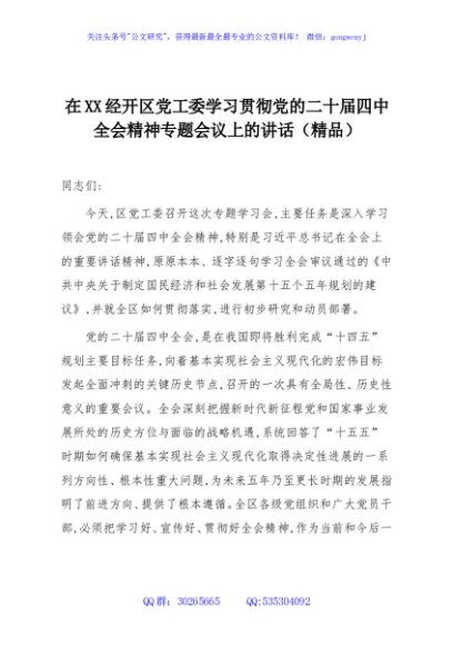 / 在XX经开区党工委学习贯彻党的二十届四中全会精神专题会议上的讲话(精品)