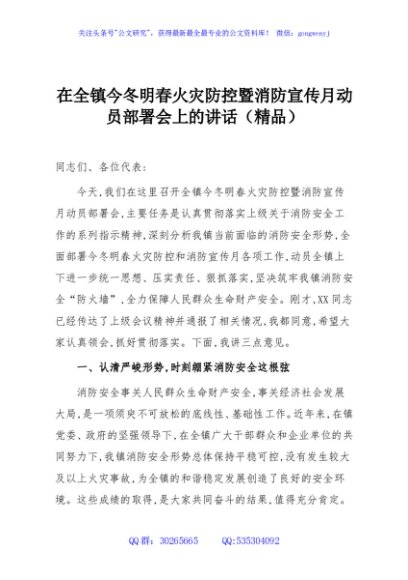 / 在全镇今冬明春火灾防控暨消防宣传月动员部署会上的讲话(精品)