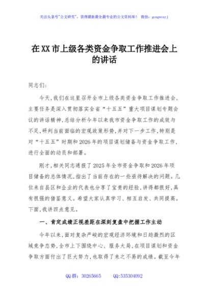 / 在XX市上级各类资金争取工作推进会上的讲话
