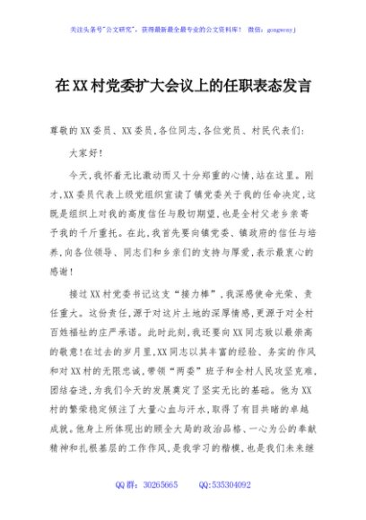 / 在XX村党委扩大会议上的任职表态发言