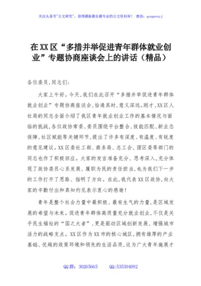 / 在XX区“多措并举促进青年群体就业创业”专题协商座谈会上的讲话(精品)
