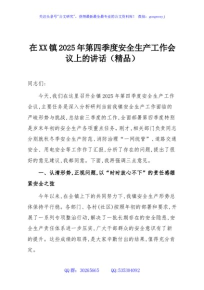 / 在XX镇2025年第四季度安全生产工作会议上的讲话(精品)